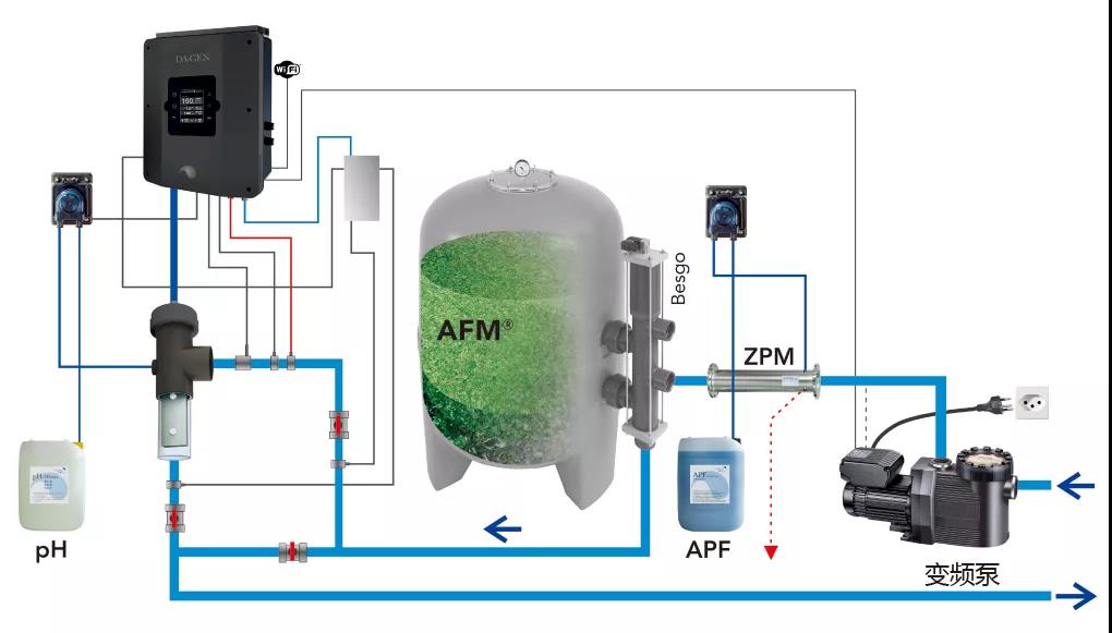 因此,為了保障游泳者的身體健康,必須采取更科學(xué)專業(yè)的消毒方式進行泳池消毒,戴思樂逐夢深藍低氯系統(tǒng)就能很好的解決余氯不達標(biāo)的問題,低氯系統(tǒng)運用水流動力學(xué)、通過正確的循環(huán)過濾和反沖洗設(shè)計,從根本上解決了影響水質(zhì)的主要因素,從而減少了對消毒藥劑的依賴,避免余氯超標(biāo)的問題出現(xiàn)。此外,低氯系統(tǒng)還結(jié)合了一種自凈化AFM活性濾料,對水質(zhì)進行無污染凈化,而且AFM濾料表面具有自我消毒功能,能對池水進行有效消毒,抑制細菌的生長。